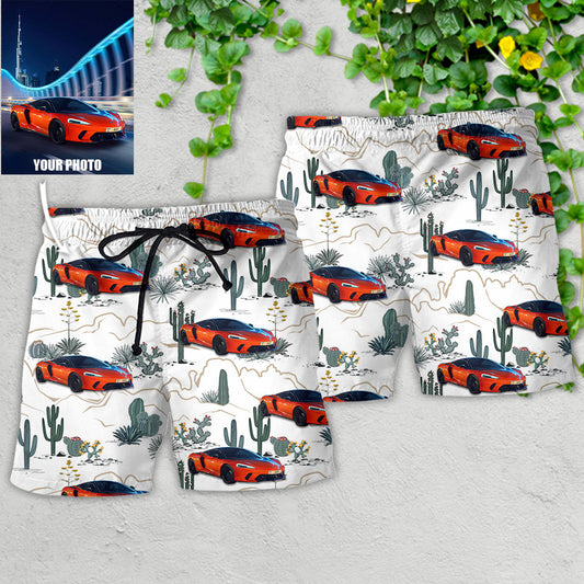 Vintage Car Tropical Island Palm Pattern Custom Photo - Beach Short